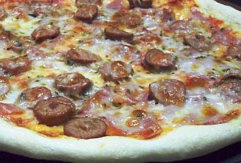 Extiende la masa sobre una bandeja de pizza engrasada ligeramente (las bandejas redondas con agujeritos), o en su defecto sobre un papel sulfurizado. Hazle unos bordes alrededor para que el relleno no se derrame durante la cocción. Echa unas 4 cucharadas de tomate, no hace falta mucha cantidad, se trata solo de pintar la masa. Espolvorea queso emmental (cantidad a tu gusto. Yo soy generosa). Reparte por encima las lonchas de jamón york, el frankfurt a rodajas y por último el queso mozarella. Espolvoreala con orégano.