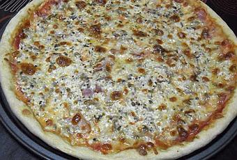 Ahora extiendela sobre una bandeja de pizza engrasada ligeramente ( o en su defecto sobre un papel sulfurizado ). Hazle unos bordes alrededor para que el relleno no se derrame durante la cocción. Echa unas 4 cucharadas de tomate, no hace falta mucha cantidad, se trata solo de pintar la masa. Reparte por encima la cebolla, después las setas y el beicon cortado en tiras. Riegalo con la nata y reparte la mozzarella rallada (yo soy generosa).Por último espolvorea con un poco de orégano.