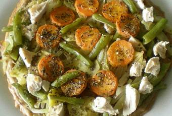 Pizza de espelta de verduras de temporada con trocitos de pollo ecológico, orégano, aceite del bueno y gomasio de Ane Miren, Francia. Esta mujer está que se sale!!!