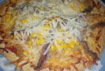 - Cortamos el pan árabe por la mitad y le agregamos el tomate frito. Después queso rayado, atún, maíz, las anchoas y después otra vez queso rayado.