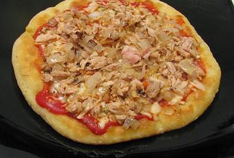 - Con ayuda de una espátula y un plato, dale la vuelta a la base y comienza a poner sobre el lado que está ya dorado el tomate frito, la mozzarella, el atún y la cebolla rehogada.