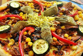 Para la masa de pizza:♥ 125g de harina de espelta♥ 85g de agua templada♥ 1,5 cdta de levadura en polvo♥ 1 cda de aceite de oliva♥ 1 cdta de salPara el relleno:♥ 3-4 tomates triturados♥ setas asiáticas♥ alcachofas♥ verduras al gusto: maíz, calabacín, pimiento rojo♥ queso rallado vegano Wilmersburger♥ orégano