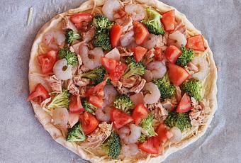 - Estiramos la masa de la pizza y la cubrimos con queso rallado. Ponemos por encima las gambas, el atún, el brócoli y si queréis tomate también.