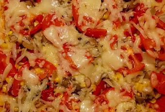 Cuando la masa esté hecha le añadimos la salsa de tomate en toda la base y la extendemos con la cuchara ó con un pincel, después el atún, el millo y los pimientos en trozos, encima los tomates (lavados) cortados finamente en rodajas, encima el queso rallado mozzarella , las láminas de parmesano y el orégano