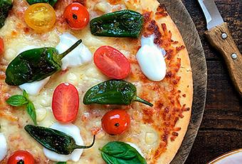 In a frying pan with little olive oil, sauté the Padrón peppers, just until they are lightly browned on the top. Remove and drain on absorbent paper. In the same pan sauté a few whole cherry tomatoes, just until they get some color without being cooked, drain. Distribute both ingredients over the pizza. Put a drizzle of olive oil over the pizza.