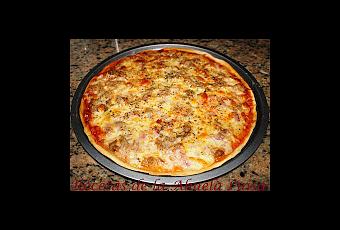 - Se extiende el tomate sobre la base. - Añadimos la mitad de la mozzarella. - Agregamos el bacon troceado y el atún muy picado. - Lo cubrimos todo con el resto de la mozzarella. - Echamos orégano por encima al gusto. - Por último metemos la pizza en el horno precalentado a 180º durante unos 10 minutos, hasta que el queso se empiece a dorar.