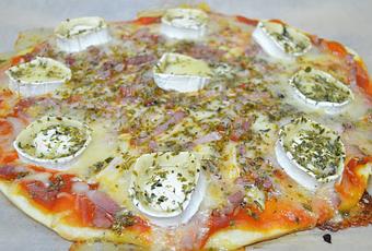 Ponemos encima de la masa, el tomate frito y lo extendemos por toda la pizza, espolvoreamos el queso mozzarella rayado y luego vamos poniendo el baicon en tiras, cortamos el rulo de cabra en trozos de un centímetro aproximadamente y lo colocamos encima del baicon, como vemos en la fotografía, espolvoreamos con orégano.