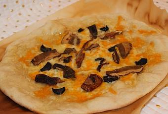10. Mientras colocamos la masa en una hoja de papel para hornear, y comenzamos a montar la pizza. Primero los quesos mozzarela y parmesano, a continuación los boletus hidratados, la trufa cortada en lonchas finas y finalmente sazonamos un poquito con la sal trufada.