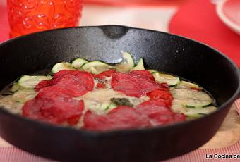 Distribuye en círculo las láminas de calabacín, yo lo he hecho en esta sartén que he pincelado con aceite y espolvoreado de harina para que no se pegue. Si no tienes una sartén apta para el horno, hazlo en la bandeja de horno que has cubierto de papel vegetal.