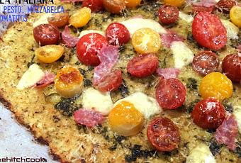 Sacamos y añadimos una capa de salsa pesto y encima los tomates cherry, el jamón York, las perlas de mozzarella, queso parmesano y volvemos a hornear durante 10-15 minutos.