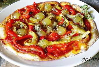 Ingredientes para 4 personas:Masa de pizza (aquí)1Pimiento y 1 berenjena escalivados o asados (aquí) 80-100 gr. de queso gorgonzola8-10 c/s de tomate frito (aquí) 2 dientes de ajoOrégano, sal10-12 uvasAceite de oliva virgen extraEn un cuenco poner el pimiento y la berenjena a tiras pequeñas, los ajos picaditos, un poco de sal y aceite mezclándolo bien. Reservar.
