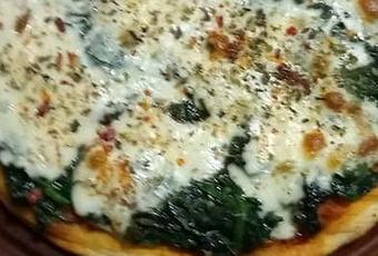 ArmadoEsparcir la espinaca salteada con el ajo sobre toda la masa previamente estirada en la mesada con palote y sobre la fuente para horno. En un jarro mezclar la leche, el almidón, sal, pimienta y nuez moscada y llevar a fuego medio revolviendo constantemente hasta que hierva y se espese. Esparcir despacito sobre toda la superficie de la pizza. Cubrir con el queso rallado.Si se desea dejar leudar 30 minutos.Cocinar 10 a 15 minutos en horno máximo.