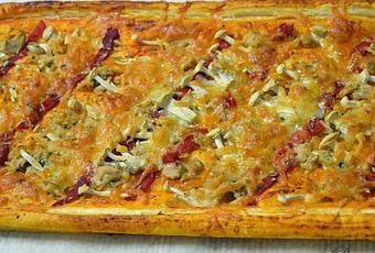 Hoy os traigo una pizza diferente a la que os traigo los #viernesdepizza, esta es de hojaldre, pero también esta muy rica, es perfecta para comer en cualquier momento.Veréis ya hace unos días que tenia una masa de hojaldre en la nevera y por miedo a que se pudiese caducar, la hice para la cena asi que con esta masa y cuatro cosas mas que había por la nevera, predecía que iba a ser una cena rica, además le he puesto estas setas tan bonitas que me he encontrado hoy en el super, no se si vosotros ya la conocéis yo las acabo de descubrir, son las setas Shimeji, son unas setas de cultivo de japón, son muy bonitas verdad? y además están ricas, yo utilice unas cuantas y el resto las saltee con ajo y perejil y las puse de picoteo, me han parecido suaves y muy ricas, ya las habéis probado vosotr@s.Bueno vamos con la pizza de hojaldre que me voy por las ramas.Ingredientes:1 masa de hojaldre4 cucharadas de tomate frito