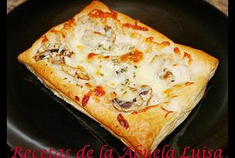 - Cortamos el pollo en tiras pequeñas, lo salteamos ligeramente en una sartén con una gotita de aceite y un poquito de sal, retiramos escurrimos el aceite y reservamos. - Limpiamos y cortamos en láminas finas los champiñones, reservamos. - Extendemos ligeramente la lámina de hojaldre con un rodillo. - En este caso la he cortado en 4 porciones individuales, pero también la podemos hacer entera. - Sobre el hojaldre disponemos los champiñones, les ponemos un poquito de sal, colocamos encima los trozos de pollo, cubrimos con el queso y rematamos espolvoreando con orégano.