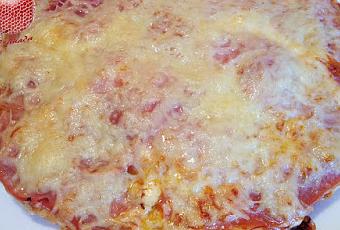 - Se esparce salsa picante sobre la masa, luego el tomate, el queso, en lonchas, el lacón y el queso rallado.