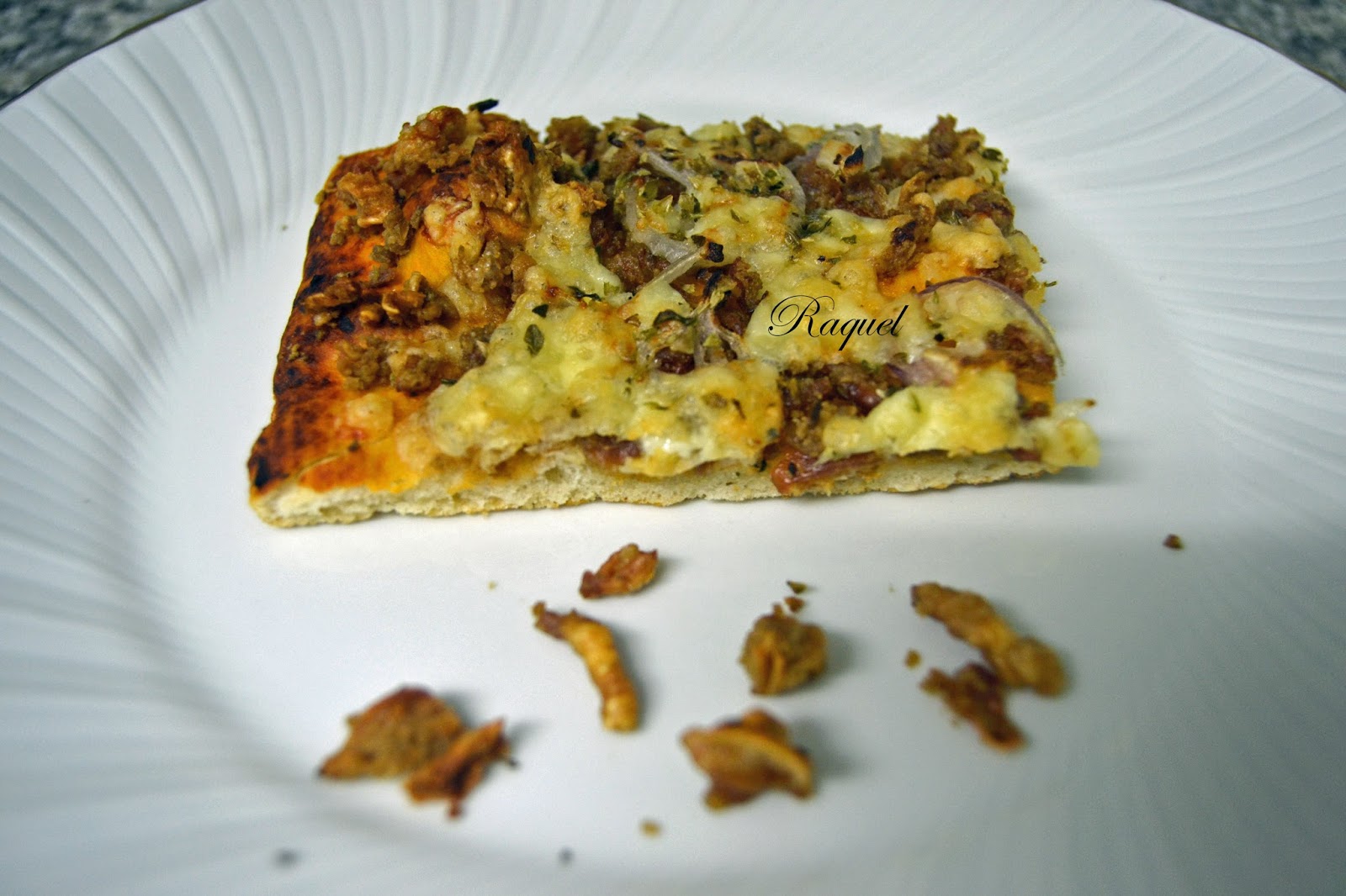 Los que ya me conocéis, sabéis que soy de las que aprovecho lo que tengo por la nevera o la despensa, no me gusta desperdiciar alimentos y si tengo que hacer una pizza aprovecho lo que tengo, como es el caso de uno de los ingredientes de esta pizza de hoy.Me gustan mucho los llardons, a lo mejor los conocéis como chicharrones en castellano, son un derivado del cerdo, de vez en cuando sin abusar compro unos pocos y me doy ese capricho.Bueno vamos a lo que os quería contar!! días atrás compre unos cuantos y ni me acordaba de que los tenia dentro de un armario de la cocina, mi sorpresa fue cuando los vi y se aproximaba su fecha de caducidad, entonces me dije, que podría hacer con ellos para gastarlos? y se me ocurrió meterlos en esta pizza, no sabia como iba a quedar y si iba a gustar, pero si no se prueba no se sabe, verdad? pues como me gusto con ese toque crujiente os paso la receta por si la queréis probar, en casa nos gusto a todos.Ingredientes:Para la masa:500 gramos de harina de fuerza280 mililitros de agua30 gramos de aceite de oliva virgen25gramos de levadura fresca