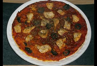 Para ello untamos toda la base con la salsa para Pizzas Helios, encima colocamos el pollo cortado en cachitos y las aceitunas en rodajitas.