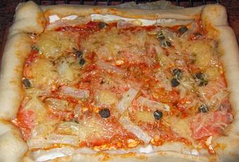 Elaboración:Lo primero que hacemos es estirar la masa y untamos por los bordes queso crema, luego doblamos la pizza. Hay mucha gente que no se come los bordes de la pizza, pero seguro que con esta forma a todos los encanta, ya que le da un sabor muy apetecible.