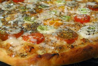 PREPARACIÓNEn un bol grande echamos la harina tamizada, la sal, y le añadimos el agua tibia en la que previamente habremos diluido la levadura y el aceite. Amasamos hasta obtener una masa que no se pegue a las paredes. La cubrimos con un paño y la dejamos 1 hora a que doble su volumen.Rallamos los tomates de pera y los 2 dientes de ajo. Les añadimos un poco de aceite de oliva y sal. Mezclamos.Cortamos los tomates Cherry por la mitad, y la cebolleta a rodajas. Rallamos el queso Parmesano.Estiramos la masa y le ponemos una cobertura de tomate rallado. Ponemos el resto de ingredientes ya cortados por encimma, así como el orgegano