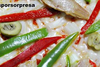 A continuación vamos poniendo los pimientos en tiras, la cebolla cortada en trocitos, la ventresca en tacos alargados y las aceitunas en rodajas por la mitad.