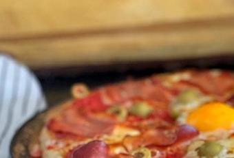Pizza, lomo curado, queso, yema de huevo, aceitunas