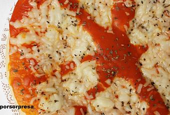 Untamos abundante tomate frito sobre la masa de pizza, y espolvoreamos con el queso mozzarella cubriendo la masa.