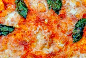 Precalentamos el horno a 200 grados. Cubrimos la masa de la pizza con salsa de tomate casera, encima trozos cortados a mano de mozzarella, unas hojas de albahaca y todo rociado de aceite de oliva. Horneamos unos 30 minutos y servimos inmediatamente.