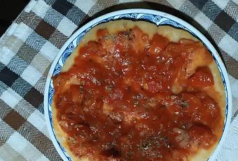 harina, sal, aceite, polvo de hornear y agua tibia. Es lo mismo que la masa de tortas fritas. Yo hace dos años atrás vendía tortas fritas y un día que me quedó masa la aproveché así. Para dos pizzas puse una taza y media de harina, una cucharada de Royal, dos cucharadas de aceite, sal media cucharada creo, no estoy segura. Ir formando una masa con agua tibia y ponerle un poquito más de harina para comenzar a amasar. La masa debe quedar lisa. Luego estirar de forma redonda del tamaño de la sartén, aprox 24 cm, viste que es del tamaño del plato.Poner un poquito de aceite a calentar en la sartén y cuando ya esté caliente poner la masa, el fuego no debe estar al máximo, del medio un poquito para abajo. Ir girándola con las manos o moviendo el sartén para que el fuego no se concentre solo en el medio de la pizza. Cuando empieza a burbujear y tiene un poco de piso, darla vuelta, colocar la salsa y también cuando haya hecho piso la sacás. Yo antes las hacía con una taza sola de harina para dos pizzas pero quedaban muy finitas. Ahora con una taza y media quedan más gorditas y te llenas jjj. Hay gente q no le pone Royal, otras q las hacen con levadura, en mi caso yo hago las tortas fritas con Royal.Te recomiendo que cuando vayas a amasar hazlo bastantito y si querés dejas un ratito a descansar la masa. Yo no lo hago. Está vez creo que fue que me quedaron más ricas xq amase más q otras veces.