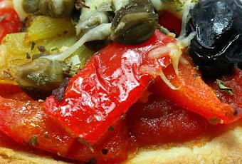 Paso 3. Sacamos nuestras mini pizzas del horno y comenzamos a prepararlas. En primer lugar añadiremos una capa de salsa napolitana. A continuación, agregamos el pimiento rojo y la cebolla. Añadimos ahora las alcaparras y una o dos olivas negras por cada mini pizza. Finalmente añadimos el queso mozzarella rallado e introducimos nuestras originales pizzas al horno durante unos diez minutos a fuego medio.