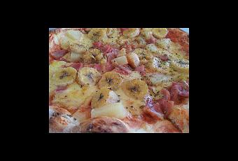 Este verano hemos vuelto a estar unos días en Maspalomas en Gran Canaria y nos dijimos ¿por qué no hacer una pizza tropical con plátano canario? Hemos tardado un poco pero aquí está. El resultado fue muy bueno nos ha encantado. Para preparar la masa seguimos las indicaciones de María. Ingredientes: 2 plátanos de canarias 2 rodajas de piña en trocitos tomate triturado 4 lonchas de jamón cocido queso en lonchas orégano