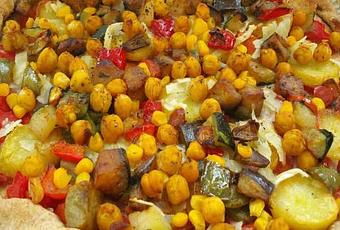- Colocamos los trozos de verdura y los garbanzos sobre una fuente de horno para rociar encima un poco de aceite