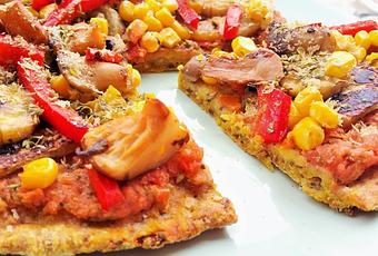 - Cortamos la berenjena en rodajas y el pimiento en tiras y las asamos a la plancha junto con las setas o champiñones. Colocamos las verduras sobre la base, espolvoreamos con la levadura de cerveza y horneamos 25-30 minutos hasta que se doren los bordes.