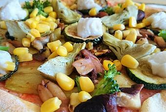 Para la masa de pizza:♥ 125g de harina de espelta♥ 85g de agua templada♥ 1,5 cdta de levadura en polvo♥ 1 cda de aceite de oliva♥ 1 cdta de salPara el relleno:♥ 3-4 tomates triturados♥ alcachofas♥ mezcla de setas♥ ramilletes de brócoli♥ maíz dulce♥ zucchini♥ berenjena♥ CreamyRisella o queso vegano al gusto (opcional)