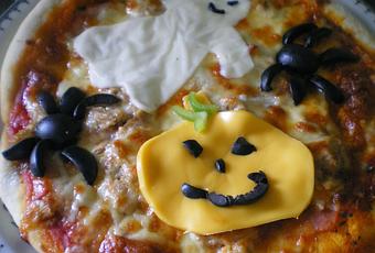 Precedemos preparando las pizzas como siempre. los ingredientes que más nos gusten.Horneamos y 5 minutos antes de que estén preparadas ponemos las lonchas con la calabaza y el fantasma.Formamos las arañas con las aceitunas negras.Terminamos de hornear y listo.Seguro que a los más peque de la casa les encanta.
