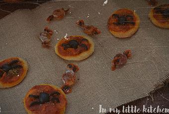 Para hacer las arañas, coger una aceituna negra y partirla por la mitad a lo largo. Una parte de la aceituna será el cuerpo de la araña. Colocar el cuerpo encima de la pizza con la parte hueca de la aceituna hacia abajo. La otra mitad vamos cortando las patitas de la araña. Se debe cortar la aceituna a lo ancho. Colocar las patitas al lado del cuerpo de la araña con el lado hueco también hacia abajo. Repetir la operación en todas las "mini-pizzas".