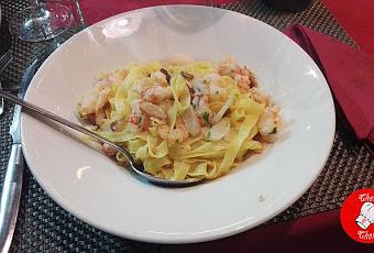 Cuando nos dieron mesa, de manteles de celulosa, nada de cuadros rojos y blancos, ya nos esperaban las deliciosas olivas aliñadas con ajo y perejil. Este año no hubo tomates secos. Una pena. Siempre que vamos a un restaurante italiano, nos ponemos de acuerdo para poder compartir plato y así poder probar pastas y pizzas. Aquí somos más de pasta, sin desmerecer las pizzas. Empezamos con unas focaccias; la Marinada, con tomate, olivas y anchoas, me gustó más que la Via Romana que es más convencional, y ensalada Provolone. Otras veces hemos pedido los champiñones rellenos al pesto. La comanda fue muy variada, espagueti carbonara, pizza calzone, lasaña… Lo que más nos gustó de la noche, con permiso de las olivas, fue la lasaña especial y sobre todo la salsa Funghi que nos recomendó el camarero que atendía nuestra mesa, o con espagueti o con ravioli o con la pasta que queramos acompañarla. Flojos me parecieron los Gamberetti Diavolini que yo pedí, unos pappardelle acompañados de gambas y ajetes. Estaban un poco secos. Otra opción recomendable es la pizza de cuatro quesos y la "crudo", con jamón serrano tomate y brie. Para beber, esta vez no hubo Lambrusco, en su lugar pedimos un crianza, Alceño selección de 2012.