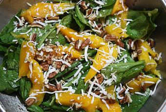 - En una ensaladera agregar el aderezo a las espinacas y mezclar.