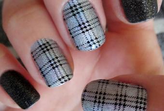 Usé como base un esmalte holográfico gris, aunque realmente no muestra el efecto holográfico como lo hacen otros esmaltes. En negro estampé la imagen que imita estos cuadros que llevan algunos tejidos (como mi falda). Y luego acentué las uñas del índice y meñique con un esmalte efecto cuero de Yes Love.