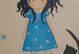 Elegimos una muñequita Gorjuss, ya sé que lo digo siempre, pero me encantan!!. Yo siempre las adapto a mi manera. En un principio iba a ser una "brujita" con su escoba y su gato, pero como el vestido iba a ir en azul, pues me pareció que no le pegaba mucho ir con una escoba, así que le dejé solo el gatito...