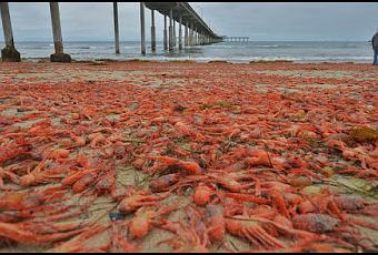 Una inmensa marea de pequeños crustáceos de la especie Pleuroncodes planipes cubre desde la segunda semana de junio diversas zonas de la costa del sur de California (Estados Unidos), entre San Diego y Los Angeles. En varias de las playas afectadas, los crustáceos muertos cubren la arena a la espera de que las mareas o los servicios de limpieza procedan a su retirada. Diversos expertos indicaron que su masiva presencia puede estar relacionada con las elevadas temperaturas del agua del mar en las últimas semanas, quizás provocadas por el fenómeno de El Niño. Los crustáceos Pleuroncodes planipes son conocidos en California como red tuna crabs: cangrejos rojos del atún, a causa de su color y por ser un alimento común de los atunes.++++++Las playas de California, cubiertas por una marea de crustá