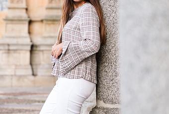 Esta blusa de cuadritos de Sfera es genial para entretiempo. Queda estupenda con jeans, es finita, le puedes poner capas encima y es bastante amplia. Tiene esos volantes plisados no solo en la cadera sino también en las mangas de campana, por lo que le da un toquecito distinto. Yo la combiné con jeans blancos, mocasines negros y un bolso acolchado negro de tipo Chanel.