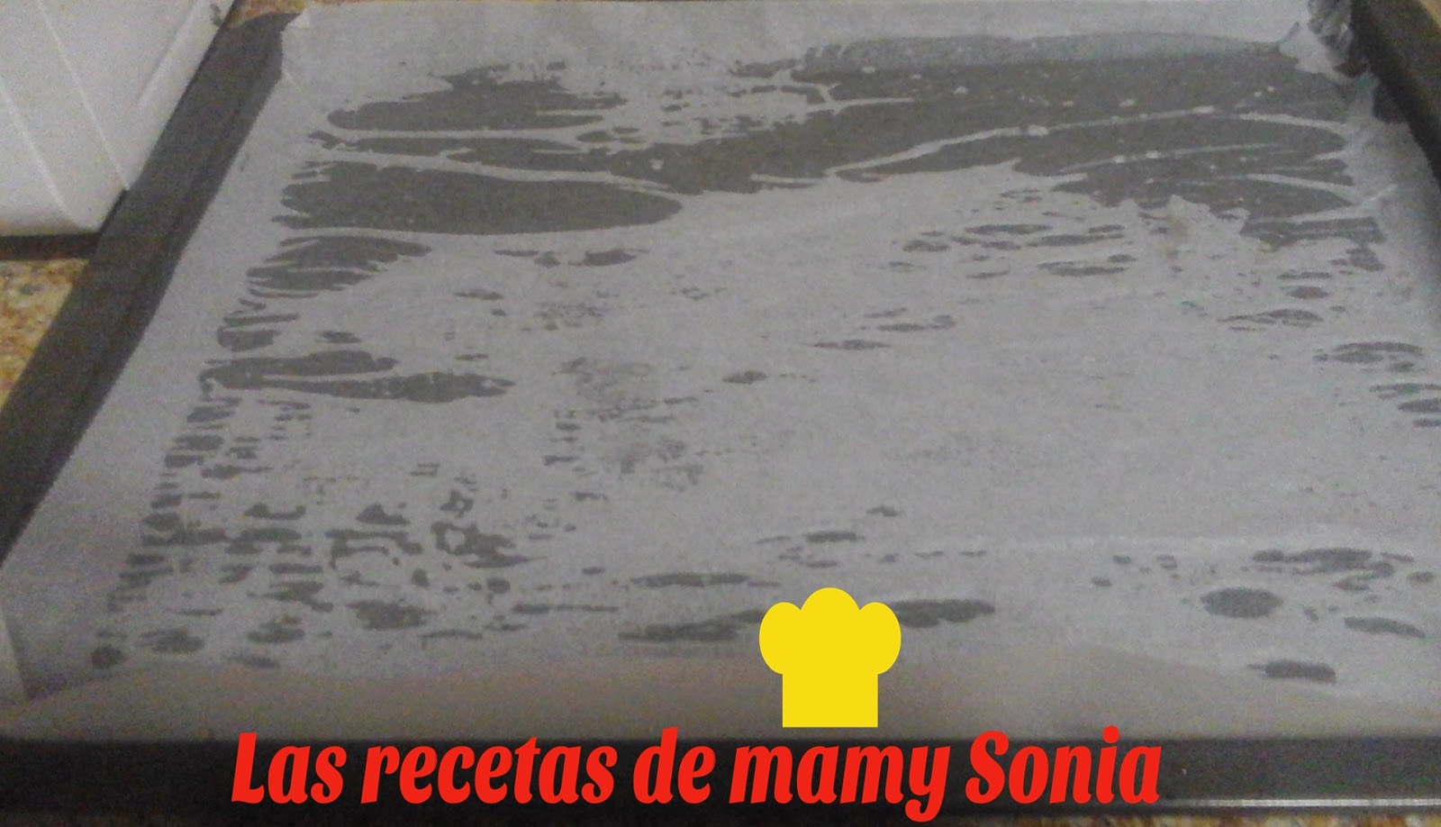 Sacamos la bandeja del horno y en caliente ponemos la plancha de bizcocho pegada al papel de hornear sobre el paño de cocina ligeramente humedecido