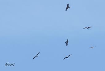 Hoy parecía que los vientos eran propicios para las grandes aves planeadoras que migran hacia el norte. Desde el nuevo centro de visitantes de las marismas de Joyel he podido observar cómo decenas de milanos negros (más de 50) sobrevolaban el monte Cincho en migración activa.