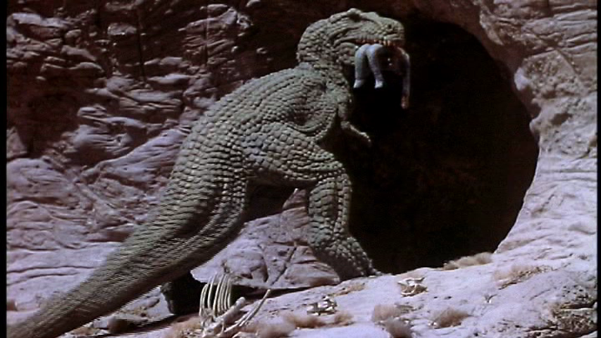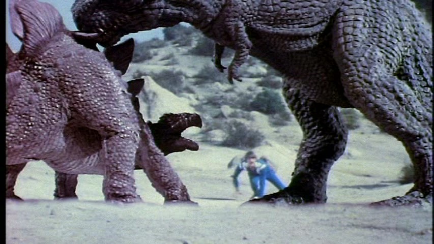 No es gran cosa, cierto, pero es honesta y muy digna y, sobre todo, no engaña a nadie. No había demasiado dinero y supongo que se ha empleado la mayor parte de él en sus stop-motions, que recuerdan una barbaridad a las criaturas del mítico Harryhausen. A ello podemos añadir sus logrados efectos de sonido y visuales. Sí, de acuerdo, las armas que se ven son de chufla, juguetes para niños (de los de antes, que ahora les daría risa), pero la tensión e intriga y peligros nos son mostrados con mucho cariño.