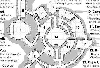 El primero es un plano de una nave siniestrada/estrellada,que puede ser un muy buen añadido para juegos como Traveller y similares, aunque con un par de leves retoques puede ser tambien un buen plano para una base oculta, por ejemplo. En cualquier caso,una ayuda excelente para cualquier partida y un buen añadido para una campaña.