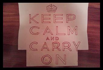 La IDEA es, hacerme una plantillas con el mensaje escogido, en este caso, el famoso "mantén la calma, y continúa". Bien lo primero dibujarlo en un papel para transferirlo luego a la tela. A ver.... no es que quiera complicarme la vida, pero me ha parecido más sencillo en tela, pues se recorta mejor, no rompe tan fácil, y me lo guardo para otras ocasiones dobladito sin problemas.