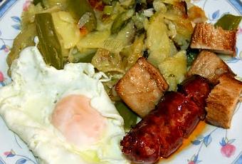 Pelamos las patatas las lavamos y las partimos como dos milímetros de gruesas y redondas a todo lo que de las patatas, si alguna se nos rompe no pasa nada ya que después al freír se rompen y le ponemos sal.Limpiamos los pimientos y los partimos a tiras, si son demasiado largas partimos por la mitad y reservamos.Limpiamos la cebolleta y la partimos (al gusto yo la parto pequeña).Ponemos el aceite de oliva en una sarten y freímos los pimientos, los sacamos y reservamos. En ese mismo aceite ponemos las patatas con la cebolleta a freír pero esto si es muy importante tiene que ser a fuego muy lento, para que se hagan pero queden muy blanditas. Las movemos de vez en cuando y con cuidado para quese rompan lo menos posible. Cuando les quede unos minutos para terminar de hacer se añaden los pimientos, se mezclan y listo para comer. (Los pimientos se pueden hacer a la vez con las patatas, yo lo hago así para que los pimientos no se rompan.)Yo hoy las he servido con un huevo frito, un chorizo y unos trocitos de lomo de orza.
