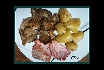 -Echamos un poco de aceite en la plancha-Ponemos los ajos laminados-Colocamos las setas y sazonamos-Cuando las setas estén casi hechas, ponemos en la plancha el lomo sazonado-Hacemos al microondaa las patatas-Emplatamos todo