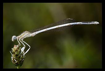 "Pequeño caballito del diablo de distribución Ibéro-magrebí. Gusta de cursos de agua de poco caudal. Se reconoce fácilmente por los tonos blanquecinos y por la amplia ditalación que presenta en las tibias de las patas medias y posteriores. Los adultos vuelan entre los meses de junio y julio. El ejemplar de la imagen es un macho, siendo las hembras de tonos más parduzcos y menos contrastados."