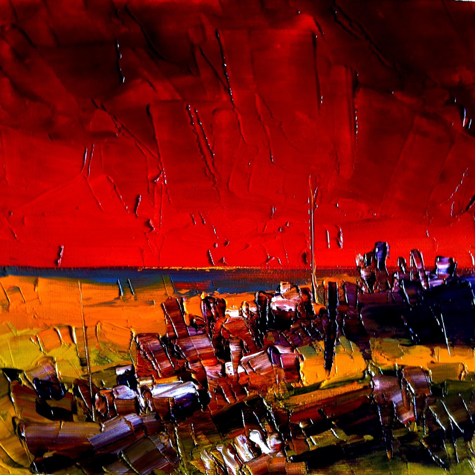 " Playa colorida de atardecer "óleo espátula lienzo. 2017.20 x 20 cm.detalles.Playa colorida atardecer